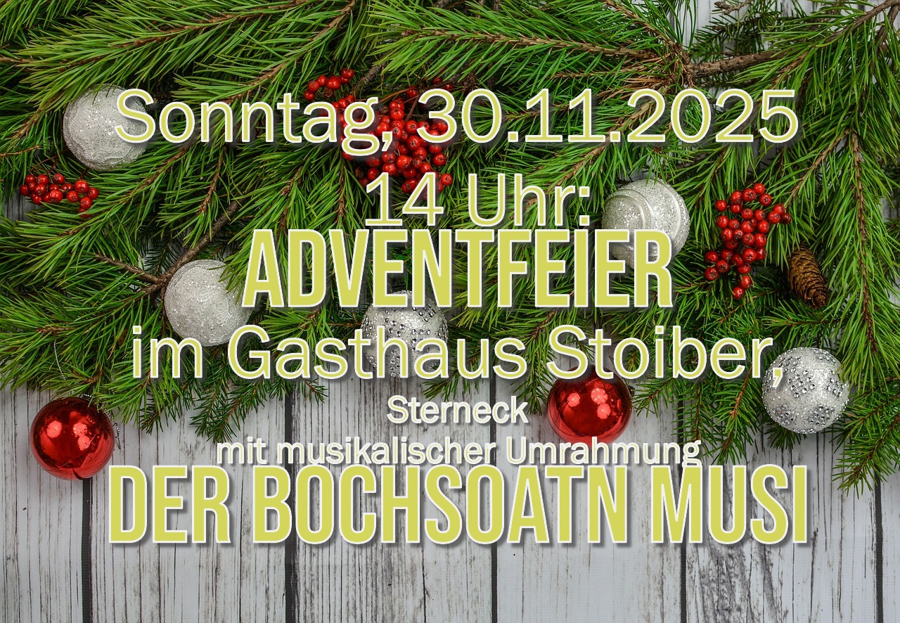 Sonntag, 30.11.2025 I 14 Uhr: Adventfeier im Gasthaus Stoiber, Sterneck mit musikalischer Umrahmung der Bochsoatn Musi