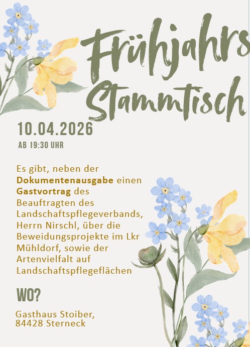 Fr, 10.04.26 I 19:30 Uhr I Frühjahrs-Stammtisch im Gasthaus Stoiber, 84428 Sterneck.: